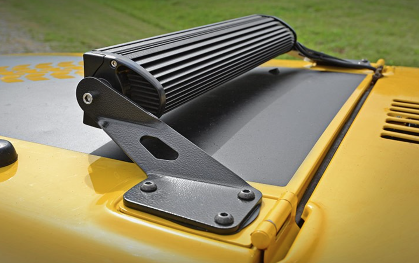 FCKLightBars 20-inch LED Hood Mount makes it easy to add extra off-road lighting and the aggressive good looks that go with it. Easily attach our 20-inch LED Light Bar to your Jeep TJ with no cutting or drilling required! This durable, bolt-on light mount attaches to your Jeep's hood using the existing hood hinge mounting point.