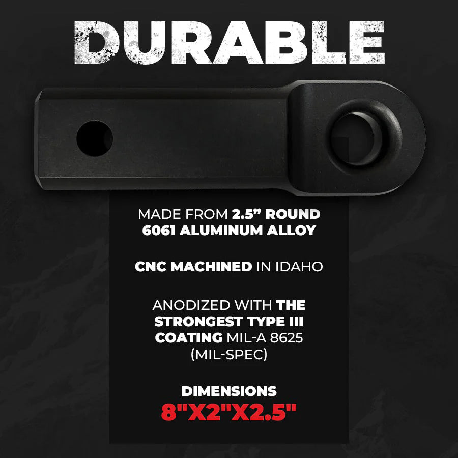Made from 2.5” round 6061 aluminum alloy, the Hitch Point provides a safe recovery point for a vehicle with a 2" receiver.