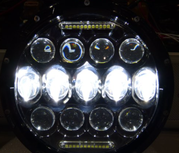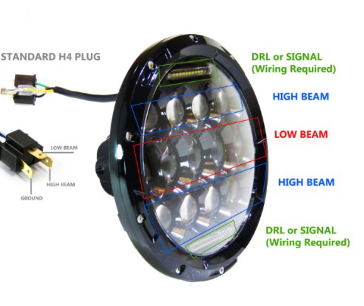(833)325-3250 This 75W LED light has low beam, high beam and DRL function. Will fit many vehicles and motorcycles with the standard 7" round headlight Including JEEPS. These headlights are sealed to prevent moisture and water build-up. Up to: 1750 Lumens in Low Beam and 3550 Lumens in High Beam...