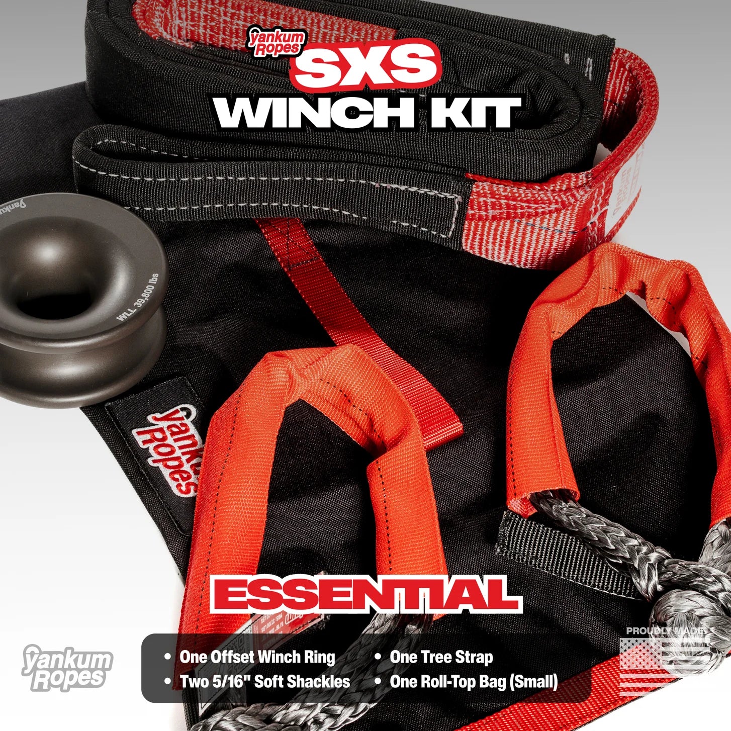 Essential: 2 Soft Shackles 5/16" 1 Tree Strap 1 Offset Winch Ring 1 Bag S Weekender 2 Soft Shackles 5/16" 1 Tree Strap 1 Double Loop Soft Shackle 5/16" X 20" 1 Offset Winch Ring Winch Line Extension 5/16" X 75' 1 Bag S  Professional - (actually more essential than the 1st package) 2 Soft Shackles 5/16" 1 Tree...